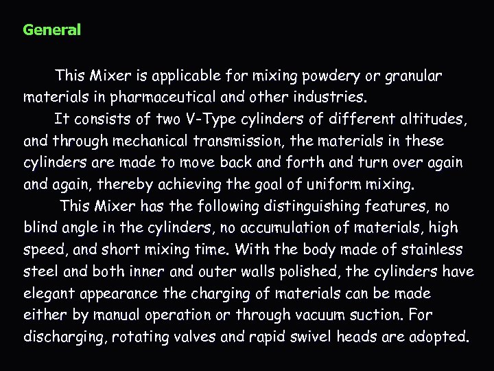 General This Mixer is applicable for mixing powdery or granular materials in pharmaceutical and other industries. It consists of two V-Type cylinders of different altitudes, and through mechanical transmission, the materials in these cylinders are made to move back and forth and turn over again and again, thereby achieving the goal of uniform mixing. This Mixer has the following distinguishing features, no blind angle in the cylinders, no accumulation of materials, high speed, and short mixing time. With the body made of stainless steel and both inner and outer walls polished, the cylinders have elegant appearance the charging of materials can be made either by manual operation or through vacuum suction. For discharging, rotating valves and rapid swivel heads are adopted.