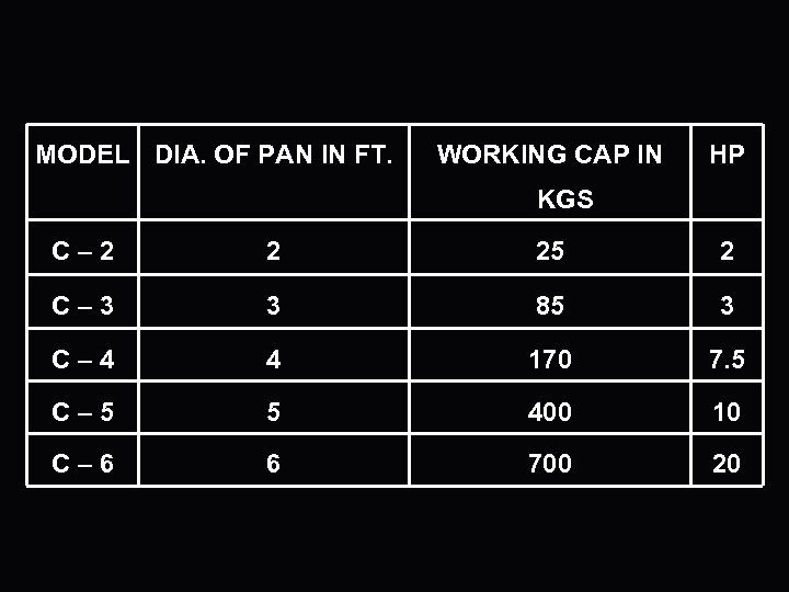 MODEL DIA. OF PAN IN FT. WORKING CAP IN HP KGS C – 2 2 25 2 C – 3 3 85 3 C – 4 4 170 7. 5 C – 5 5 400 10 C – 6 6 700 20