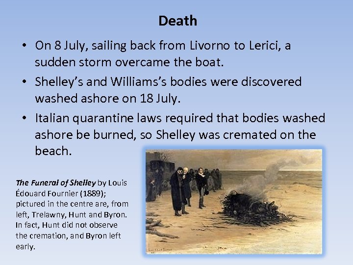 Death • On 8 July, sailing back from Livorno to Lerici, a sudden storm overcame the boat. • Shelley’s and Williams’s bodies were discovered washed ashore on 18 July. • Italian quarantine laws required that bodies washed ashore be burned, so Shelley was cremated on the beach. The Funeral of Shelley by Louis Édouard Fournier (1889); pictured in the centre are, from left, Trelawny, Hunt and Byron. In fact, Hunt did not observe the cremation, and Byron left early.