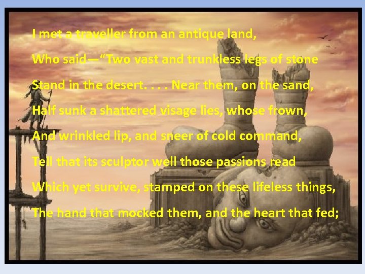 I met a traveller from an antique land, Who said—“Two vast and trunkless legs of stone Stand in the desert. . Near them, on the sand, Half sunk a shattered visage lies, whose frown, And wrinkled lip, and sneer of cold command, Tell that its sculptor well those passions read Which yet survive, stamped on these lifeless things, The hand that mocked them, and the heart that fed;