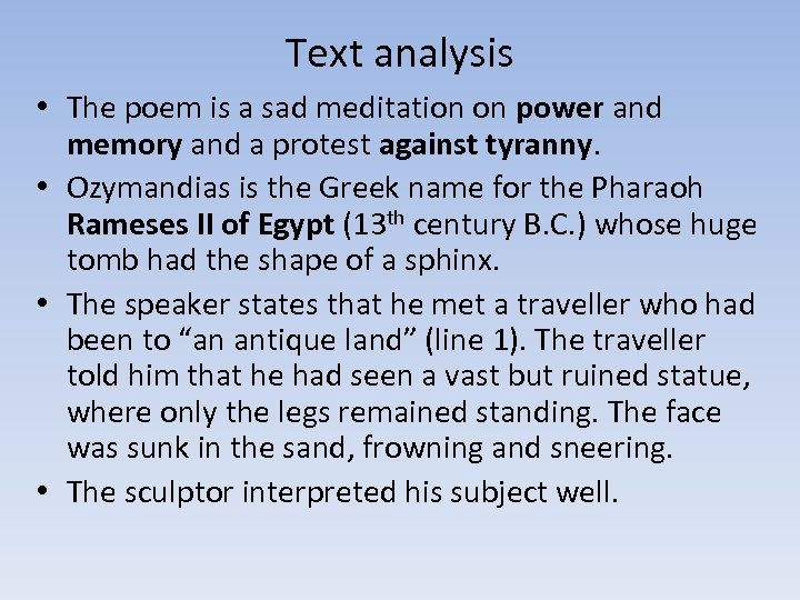 Text analysis • The poem is a sad meditation on power and memory and a protest against tyranny. • Ozymandias is the Greek name for the Pharaoh Rameses II of Egypt (13 th century B. C. ) whose huge tomb had the shape of a sphinx. • The speaker states that he met a traveller who had been to “an antique land” (line 1). The traveller told him that he had seen a vast but ruined statue, where only the legs remained standing. The face was sunk in the sand, frowning and sneering. • The sculptor interpreted his subject well.