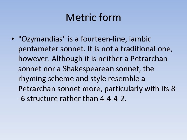 Metric form • "Ozymandias" is a fourteen-line, iambic pentameter sonnet. It is not a traditional one, however. Although it is neither a Petrarchan sonnet nor a Shakespearean sonnet, the rhyming scheme and style resemble a Petrarchan sonnet more, particularly with its 8 -6 structure rather than 4 -4 -4 -2.