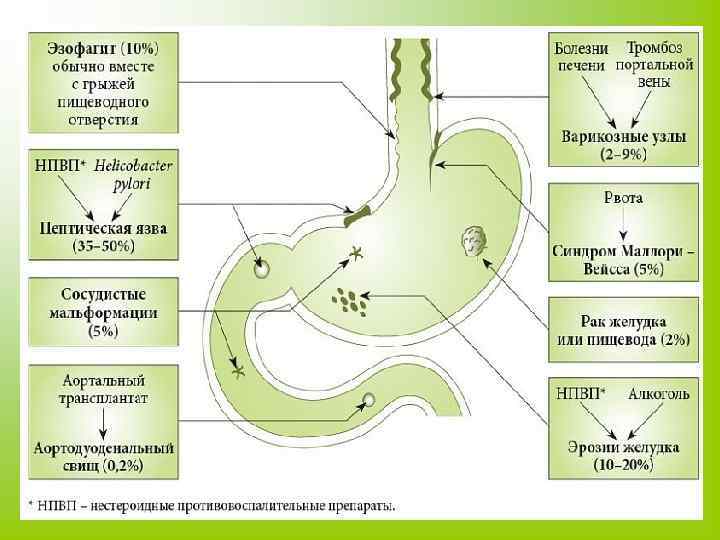 15. Суперинфект (генетически модифицированная форма Е. Coli); 16. Грыжи пищеводного отверстия; 17. Варикозные расширения вен пищевода; 18. Послеоперационное расхождение швов; 19. Лекарственные препараты (НПВП); 17. Рак (желудка, кишечника); 20. Сосудистые мальформации; 21. Синдром Ма ллори — Ве йсс (по МКБ-10: желудочнопищеводный разрывно-геморрагический синдром); 22. Аортальный трансплантант (аортодуоденальный свищ) 23. Антикоагулянты 24. Глюкокортикоиды