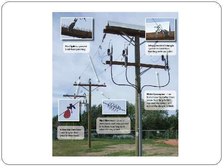 В частности, можно рекомендовать следующие меры: Установку бестраверсных деревянных опор нового поколения, разработанных Институтом «РОСЭП» и рекомендованных Департаментом электрических сетей (циркуляр № 11 -02/1 -05 от 30. 10. 2001) Установку опор с подвесными изоляторами Установку опор с деревянными траверсами. Действующие ЛЭП, представляющие опасность электропоражения для птиц, могут оснащаться специальными эффективными птицезащитными устройствами, а в случае износа или существенного повреждения опор и траверс необходимо производить их замену на опоры и траверсы, безопасные для птиц.