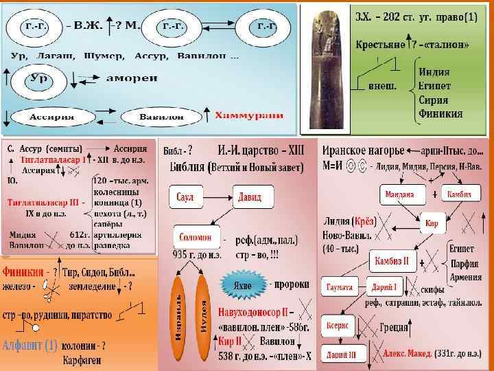 В земледельческих общинах Передней Азии в 3 тысячелетии до н. э. начали складываться государственные образования. Город с прилегающей территорией, на которой население занималось земледелием, становился городомгосударством. Правитель города также носил титул верховного жреца. Вначале правители избирались населением, а затем власть стала передаваться по наследству. Так появились правители–монархи. Между городами-государствами часто вспыхивали войны. Наиболее известными городами–государствами были Ур, Лагаш, Шумер, Ассур, Вавилон. Сильная власть в форме деспотической монархии была установлена в Уре. В постоянной борьбе с кочевыми народами амореями Ур был ослаблен, но усиливаются два влиятельных государства Ассирия и Вавилон. Своего наивысшего могущества Вавилон достигает при царе Хаммурапи, который сумел подчинить Ассирию.