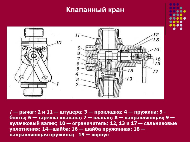 Клапанный кран / — рычаг; 2 и 11 — штуцера; 3 — прокладка; 4 — пружина; 5 -болты; 6 — тарелка клапана; 7 — клапан; 8 — направляющая; 9 — кулачковый валик; 10 — ограничитель; 12, 13 и 17 — сальниковые уплотнения; 14—шайба; 16 — шайба пружинная; 18 — направляющая пружины; 19 — корпус