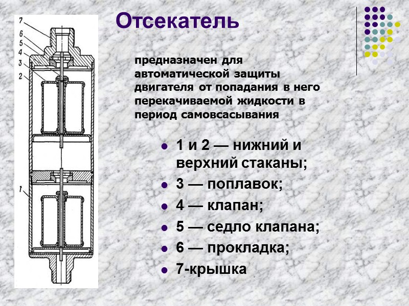 Отсекатель 1 и 2 — нижний и верхний стаканы; 3 — поплавок; 4 — клапан; 5 — седло клапана; 6 — прокладка; 7-крышка предназначен для автоматической защиты двигателя от попадания в него перекачиваемой жидкости в период самовсасывания