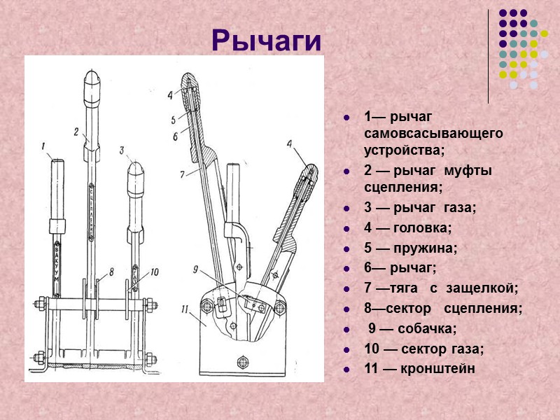 Рычаги 1— рычаг самовсасывающего устройства; 2 — рычаг муфты сцепления; 3 — рычаг газа; 4 — головка; 5 — пружина; 6— рычаг; 7 —тяга с защелкой; 8—сектор сцепления; 9 — собачка; 10 — сектор газа; 11 — кронштейн