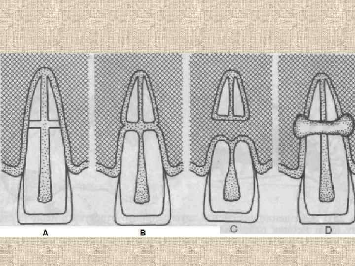 Методы шинирования зубов при переломах корней • 1. Проволочно-композитная шина. Из твердой ортодонтической проволоки толщиной 0, 6 — 0, 8 мм формируется дуга, которая обычно охватывает по 2 здоровых зуба с каждой стороны от поврежденного. После очистки губной поверхности фронтальных зубов середина коронки протравливается. На протравленную поверхность последовательно наносятся бонд, композит, в него без натяжения устанавливается проволока, и композит полимеризуется. Затем наносится новая порция композита до полного закрытия проволочной шины. Края проволоки также закрывают, чтобы не травмировали слизистую оболочку полости рта. Травмированный зуб следует выключить из окклюзии, что достигается разобщением прикуса пластмассовой каппой или пластинкой с окклюзионными накладками. • 2. Соединение композитом поврежденного зуба с двумя соседними зубами. • 3. Назубная шина-каппа