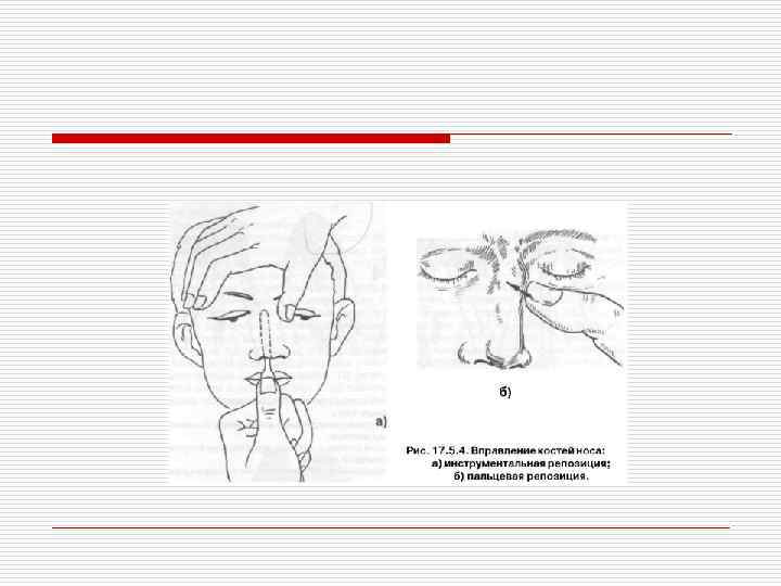 Лечение. o o При оказании специализированной помощи нужно стремиться к полному восстановлению формы наружного носа и его физиологических функций. Вправление костных отломков носа осуществляется под местным или общим обезболиванием. Вправление отломков костей носа при боковом смещении спинки носа проводят большим пальцем правой руки при искривлении влево и соответственно левой руки - при искривлении вправо. В момент смещения отломков в нормальное положение слышен характерный хруст. Смещенные кзади отломки (в сторону полости носа) вправляются с помощью носового узкого элеватора, на который предварительно надевают стерильную резиновую трубку, обеспечивающую атравматичность. При отсутствии элеватора вправление костей носа проводят прямым пинцетом, концы которого обернуты марлей. Для предупреждения повторного смещения и удержании их в правильном положении, тампонируют верхний и средний носовые ходы йодоформной турундой, смоченной в вазелиновом масле. В нижний носовой ход вводят резиновые, обернутые йодоформной турундой, трубки для обеспечения дыхания. Эндоназальная фиксация удерживается в течение шести - семи дней. Через 3 дня мы не меняем тампоны, как рекомендуют некоторые авторы (Р. Ф. Низова, 1986).