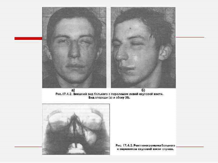 Клиника. o o Изолированные переломы скуловой кости со смещением отломков имеют следующую симптоматику: деформация лица за счет западения (уплощения) мягких тканей скуловой области (возникает из-за смещения скуловой кости); наличие симптома "ступеньки" в средней части нижнего края глазницы и в области скуло - альвеолярного гребня; может быть кровоизлияние в слизистую оболочку переходной складки в области верхних премоляров и первого или второго моляра; онемение кожи подглазничной области и нижнего века, боковой поверхности носа, верхней губы и десны верхних зубов (возникает из-за повреждения подглазничного нерва); кровоизлияние в клетчатку орбиты и в склеру глаза; может возникнуть хемоз (из-за повреждения наружной стенки глазницы); кровотечение из носа (в результате повреждения верхнечелюстной пазухи). Жалобы на ограничение открывания рта. При смещении лобного отростка скуловой кости в полость глазницы наблюдаются боли и затруднение движения глазного яблока. При значительных смещениях скуловой кости вниз возможна диплопия. На обзорной рентгенограмме костей лицевого скелета (носоподбородочная укладка) имеется нарушение целостности нижнего и наружного края глазницы, непрерывности в области скуло - альвеолярного гребня и височного отростка скуловой кости, понижение прозрачности верхнечелюстной пазухи (за счет гемосинуса). При изолированном переломе скуловой дуги имеется западение мягких тканей за счет смещения отломков кнутри и вниз. Западение мягких тканей маскируется за счет быстро возникающего отека. Отмечается, в той или иной степени выраженности, ограничение и болезненность при открывании рта, а также затруднение боковых движений нижней челюсти на поврежденной стороне.