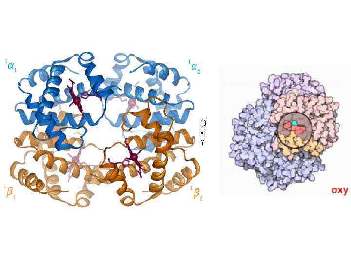 Транспорт кислорода: гемоглобин (тетрамер) Запасание кислорода: миоглобин (мономер)