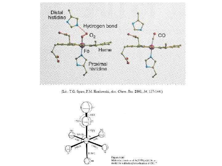 Fe(III) (HS) is larger than Fe(III) (LS) Fe is displaced from the porphyrin plane by 0. 6 A Bent O 2 coordination Fe is in the porphyrin plane