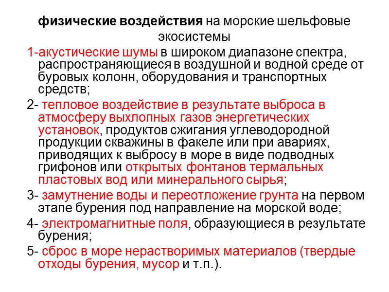 физические воздействия на морские шельфовые экосистемы 1-акустические шумы в широком диапазоне спектра, распространяющиеся в воздушной и водной среде от буровых колонн, оборудования и транспортных средств; 2- тепловое воздействие в результате выброса в атмосферу выхлопных газов энергетических установок, продуктов сжигания углеводородной продукции скважины в факеле или при авариях, приводящих к выбросу в море в виде подводных грифонов или открытых фонтанов термальных пластовых вод или минерального сырья; 3- замутнение воды и переотложение грунта на первом этапе бурения под направление на морской воде; 4- электромагнитные поля, образующиеся в результате бурения; 5- сброс в море нерастворимых материалов (твердые отходы бурения, мусор и т.п.).