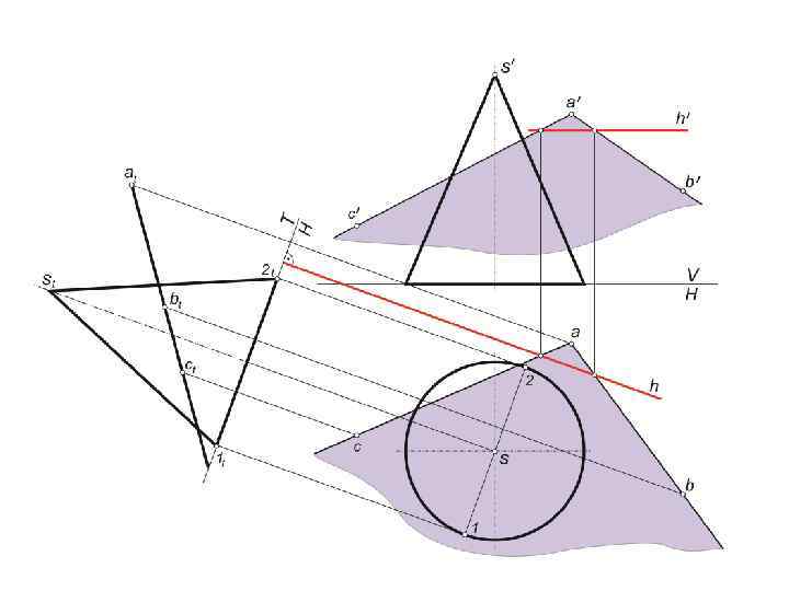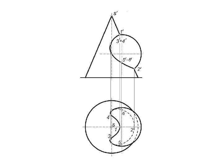 Особые случаи пересечения поверхностей Если оси двух пересекающихся поверхностей вращения пересекаются и параллельны одной из плоскостей проекций, то всякая сфера с центром в точке пересечения осей пересечет каждую из поверхностей по окружностям, которые проецирутся на одну из плоскостей проекций в виде отрезков прямых линий