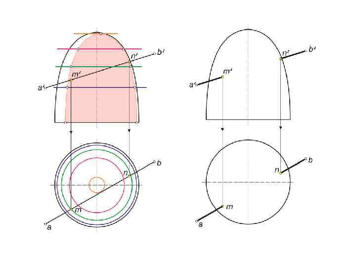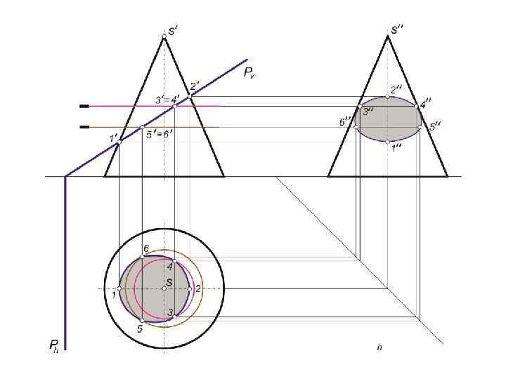 Пересечение сферы плоскостью Любая плоскость пересекает сферу по окружности. Окружность на плоскость проекций может проецироваться : - в натуральную величину (плоскость уровня); - в виде отрезка (проецирующая плоскость); - в виде эллипса (плоскость общего положения)
