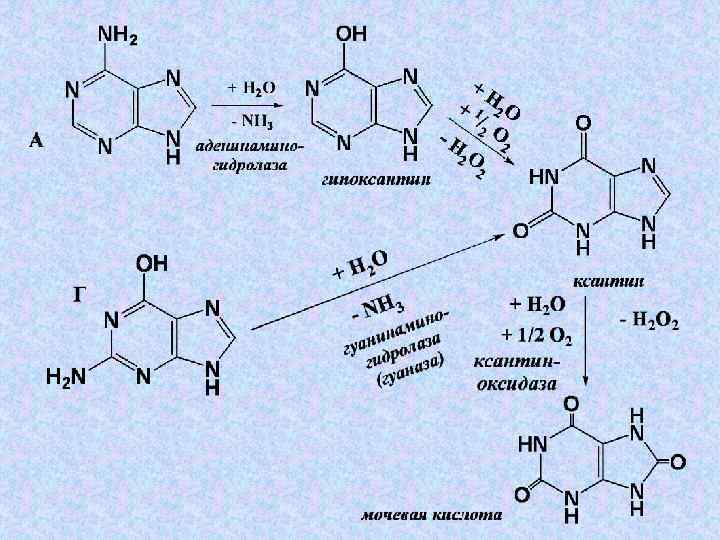 Гипоксантин-ДНК-гликозидаза Выполняет аналогичную функцию, но по отношению к гипоксантину, образующемуся из аденина: гипоксантину Эти процессы имеют существенное значение в репарации (восстановлении структуры) ДНК. Сходным образом происходит репарация ДНК, содержащей алкилированные азотистые основания и аналоги азотистых оснований.