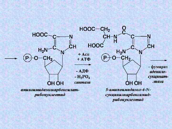 Суммарное уравнение этапа 4: 5 -фосфорибозилглицинамид + 2–СНО(Вит ВС) + Глн + 3 АТФ + СО 2 + Асп → → 2 Н 2 О + Глу + 3 АДФ + 3 Н 3 РО 4 + Фумарата + ИМФ