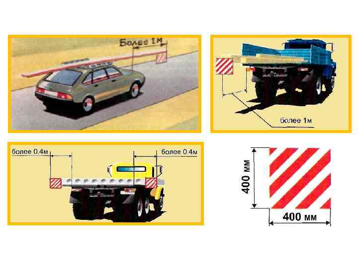 Груз, выступающий за габариты транспортного средства спереди и сзади более чем на 1 м или сбоку более чем на 0, 4 м от внешнего края габаритного огня, должен быть обозначен опознавательными знаками «Крупногабаритный груз» , а в темное время суток и в условиях недостаточной видимости, кроме того, спереди — фонарем или световозвращателем белого цвета, сзади — фонарем или световозвращателем красного цвета.