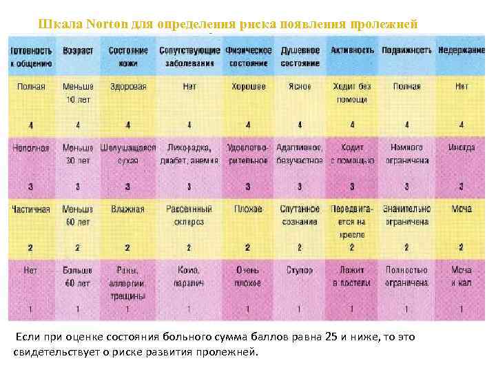 Шкала Norton для определения риска появления пролежней Если при оценке состояния больного сумма баллов равна 25 и ниже, то это свидетельствует о риске развития пролежней.