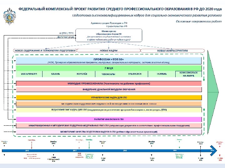 Приоритеты развития системы среднего профессионального образования определены: Ø «майскими» и последующими указами Президента Российской Федерации; Ø Стратегией развития системы подготовки рабочих кадров и формирования прикладных квалификаций в Российской Федерации 2013 -2020 ; Ø Комплексом мер, направленных на совершенствование системы среднего профессионального образования, на 2015 - 2020 годы. Задачи: 1. Обеспечить обновление содержания профессионального образования и внедрение в системе среднего профессионального образования современных методик и образовательных технологий 2. Обеспечить создание условий для распространения в системе среднего профессионального образования лучших практик и разработок 3. Создать инструмент управления проводимыми изменениями - систему мониторинга качества среднего профессионального образования и сформировать саму систему оценки качества подготовки рабочих кадров в Российской Федерации Мегапроект ТОП-50