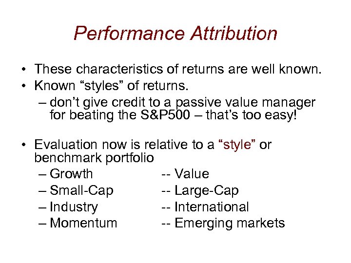 Performance Attribution • These characteristics of returns are well known. • Known “styles” of returns. – don’t give credit to a passive value manager for beating the S&P 500 – that’s too easy! • Evaluation now is relative to a “style” or benchmark portfolio – Growth -- Value – Small-Cap -- Large-Cap – Industry -- International – Momentum -- Emerging markets