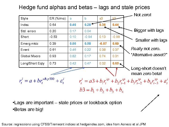 Hedge fund alphas and betas – lags and stale prices Style ER (%/mo) a b a 3 b 3 Index 0. 64 0. 46 0. 28 0. 36 0. 44 Std. errors 0. 20 0. 17 0. 04 Short -0. 53 0. 10 -0. 94 0. 13 -0. 99 Emerg mkts 0. 39 0. 00 0. 58 -0. 07 0. 69 Event 0. 61 0. 46 0. 22 0. 38 0. 37 Global Macro 0. 93 0. 82 0. 17 0. 74 0. 31 Long/Short Eqty 0. 73 0. 42 0. 47 0. 32 Not zero! 0. 65 Bigger with lags Smaller with lags Really not zero. “Alternative asset? ” Long-short doesn’t mean zero beta! • Lags are important – stale prices or lookback option • Betas are big! Source: regressions using CFSB/Tremeont indices at hedgeindex. com, idea from Asness et al JPM