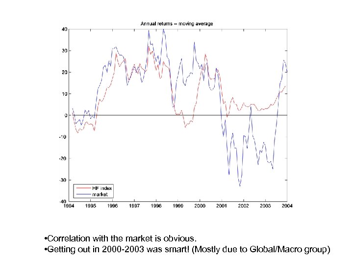 • Correlation with the market is obvious. • Getting out in 2000 -2003 was smart! (Mostly due to Global/Macro group)