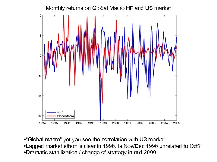 Monthly returns on Global Macro HF and US market • “Global macro” yet you see the correlation with US market • Lagged market effect is clear in 1998. Is Nov/Dec 1998 unrelated to Oct? • Dramatic stabilization / change of strategy in mid 2000