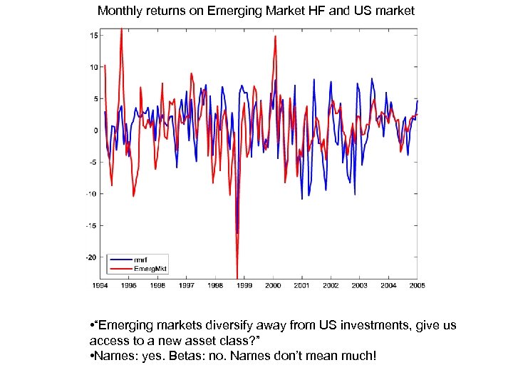 Monthly returns on Emerging Market HF and US market • “Emerging markets diversify away from US investments, give us access to a new asset class? ” • Names: yes. Betas: no. Names don’t mean much!