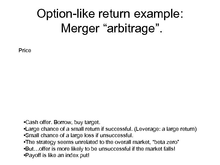Option-like return example: Merger “arbitrage”. Price • Cash offer. Borrow, buy target. • Large chance of a small return if successful. (Leverage: a large return) • Small chance of a large loss if unsuccessful. • The strategy seems unrelated to the overall market, “beta zero” • But…offer is more likely to be unsuccessful if the market falls! • Payoff is like an index put!