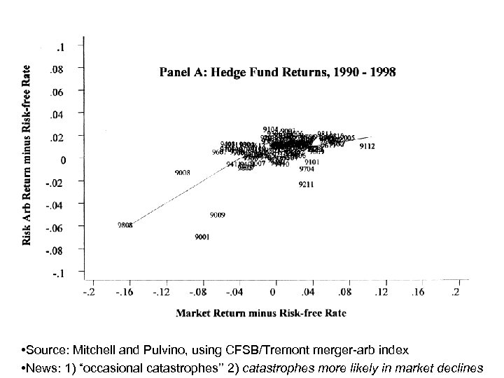 • Source: Mitchell and Pulvino, using CFSB/Tremont merger-arb index • News: 1) “occasional catastrophes’’ 2) catastrophes more likely in market declines