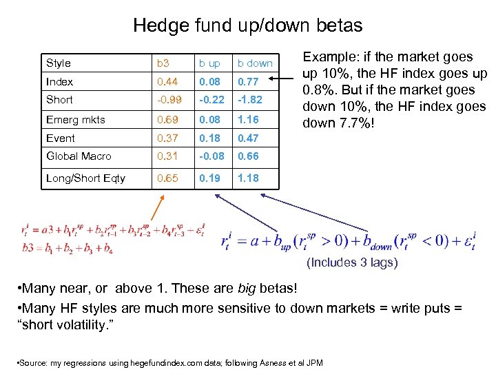 Hedge fund up/down betas Style b 3 b up b down Index 0. 44 0. 08 0. 77 Short -0. 99 -0. 22 -1. 82 Emerg mkts 0. 69 0. 08 1. 16 Event 0. 37 0. 18 0. 47 Global Macro 0. 31 -0. 08 0. 66 Long/Short Eqty 0. 65 0. 19 Example: if the market goes up 10%, the HF index goes up 0. 8%. But if the market goes down 10%, the HF index goes down 7. 7%! 1. 18 (Includes 3 lags) • Many near, or above 1. These are big betas! • Many HF styles are much more sensitive to down markets = write puts = “short volatility. ” • Source: my regressions using hegefundindex. com data; following Asness et al JPM