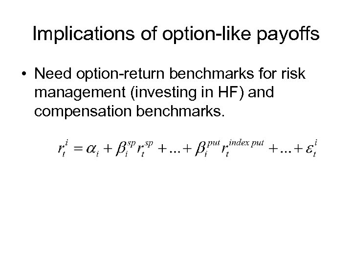 Implications of option-like payoffs • Need option-return benchmarks for risk management (investing in HF) and compensation benchmarks.