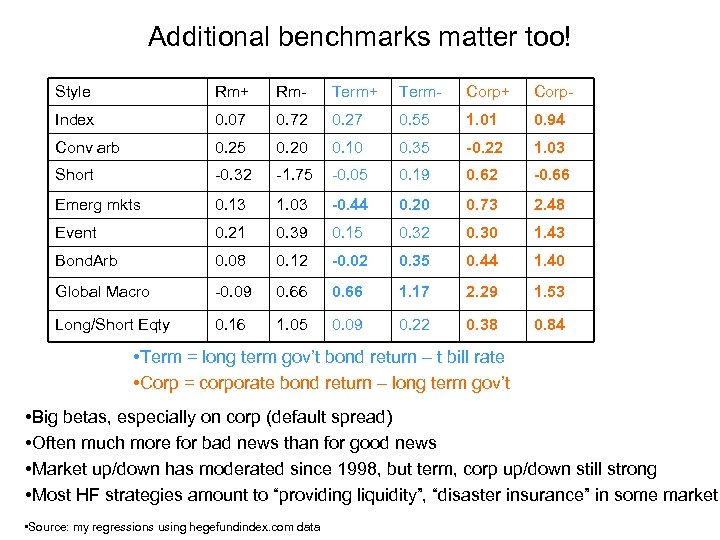 Additional benchmarks matter too! Style Rm+ Rm- Term+ Term- Corp+ Corp- Index 0. 07 0. 72 0. 27 0. 55 1. 01 0. 94 Conv arb 0. 25 0. 20 0. 10 0. 35 -0. 22 1. 03 Short -0. 32 -1. 75 -0. 05 0. 19 0. 62 -0. 66 Emerg mkts 0. 13 1. 03 -0. 44 0. 20 0. 73 2. 48 Event 0. 21 0. 39 0. 15 0. 32 0. 30 1. 43 Bond. Arb 0. 08 0. 12 -0. 02 0. 35 0. 44 1. 40 Global Macro -0. 09 0. 66 1. 17 2. 29 1. 53 Long/Short Eqty 0. 16 1. 05 0. 09 0. 22 0. 38 0. 84 • Term = long term gov’t bond return – t bill rate • Corp = corporate bond return – long term gov’t • Big betas, especially on corp (default spread) • Often much more for bad news than for good news • Market up/down has moderated since 1998, but term, corp up/down still strong • Most HF strategies amount to “providing liquidity”, “disaster insurance” in some market • Source: my regressions using hegefundindex. com data