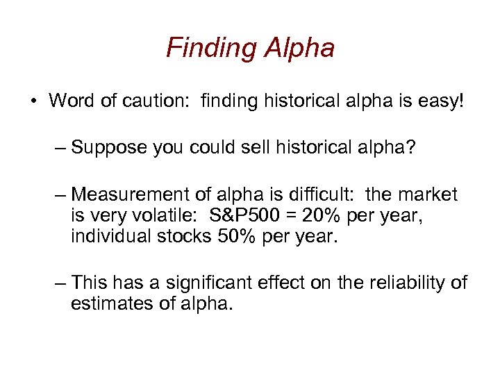 Finding Alpha • Word of caution: finding historical alpha is easy! – Suppose you could sell historical alpha? – Measurement of alpha is difficult: the market is very volatile: S&P 500 = 20% per year, individual stocks 50% per year. – This has a significant effect on the reliability of estimates of alpha.