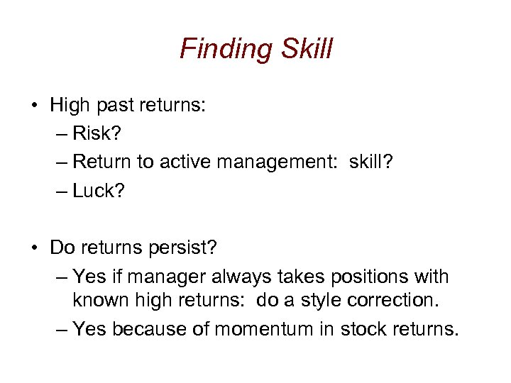 Finding Skill • High past returns: – Risk? – Return to active management: skill? – Luck? • Do returns persist? – Yes if manager always takes positions with known high returns: do a style correction. – Yes because of momentum in stock returns.