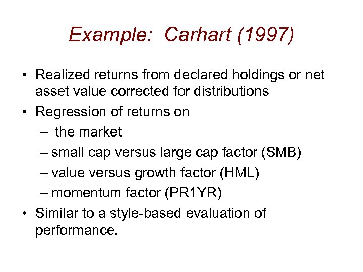 Example: Carhart (1997) • Realized returns from declared holdings or net asset value corrected for distributions • Regression of returns on – the market – small cap versus large cap factor (SMB) – value versus growth factor (HML) – momentum factor (PR 1 YR) • Similar to a style-based evaluation of performance.