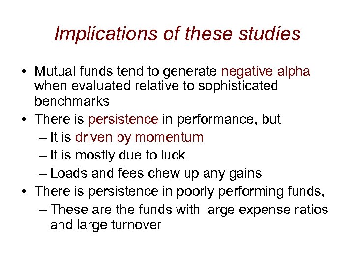 Implications of these studies • Mutual funds tend to generate negative alpha when evaluated relative to sophisticated benchmarks • There is persistence in performance, but – It is driven by momentum – It is mostly due to luck – Loads and fees chew up any gains • There is persistence in poorly performing funds, – These are the funds with large expense ratios and large turnover