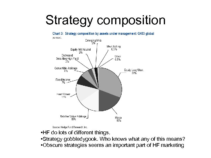 Strategy composition • HF do lots of different things. • Strategy gobbledygook. Who knows what any of this means? • Obscure strategies seems an important part of HF marketing