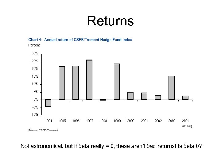 Returns Not astronomical, but if beta really = 0, these aren’t bad returns! Is beta 0?