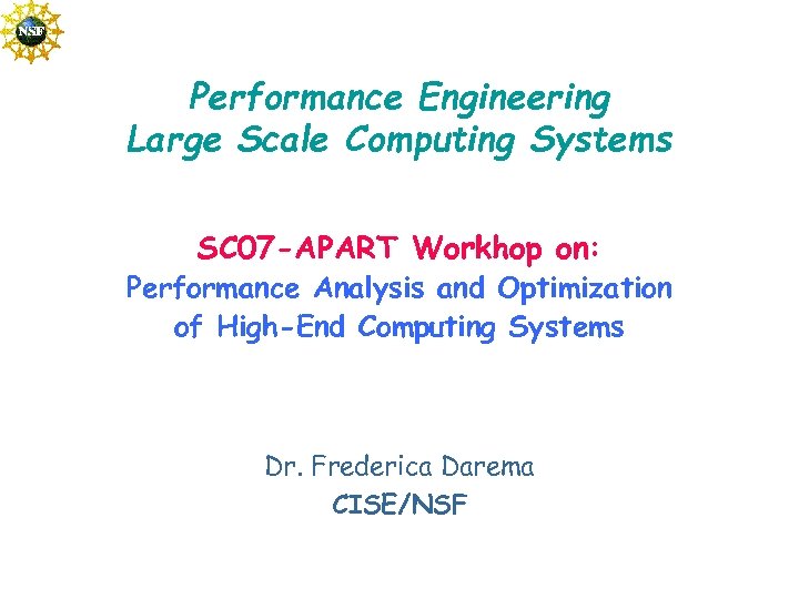 Performance Engineering Large Scale Computing Systems SC 07 -APART Workhop on: Performance Analysis and Optimization of High-End Computing Systems Dr. Frederica Darema CISE/NSF