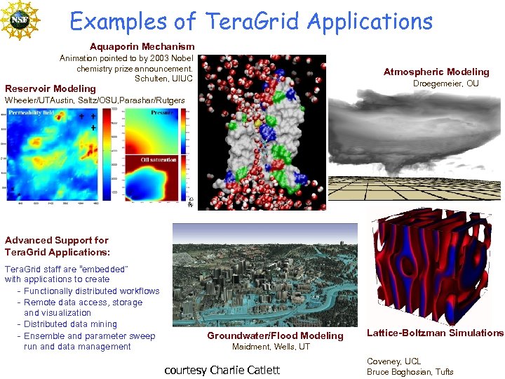 Examples of Tera. Grid Applications Aquaporin Mechanism Animation pointed to by 2003 Nobel chemistry prize announcement. Schulten, UIUC Atmospheric Modeling Droegemeier, OU Reservoir Modeling Wheeler/UTAustin, Saltz/OSU, Parashar/Rutgers Advanced Support for Tera. Grid Applications: Tera. Grid staff are “embedded” with applications to create - Functionally distributed workflows - Remote data access, storage and visualization - Distributed data mining - Ensemble and parameter sweep run and data management Groundwater/Flood Modeling Lattice-Boltzman Simulations Maidment, Wells, UT courtesy Charlie Catlett Coveney, UCL Bruce Boghosian, Tufts