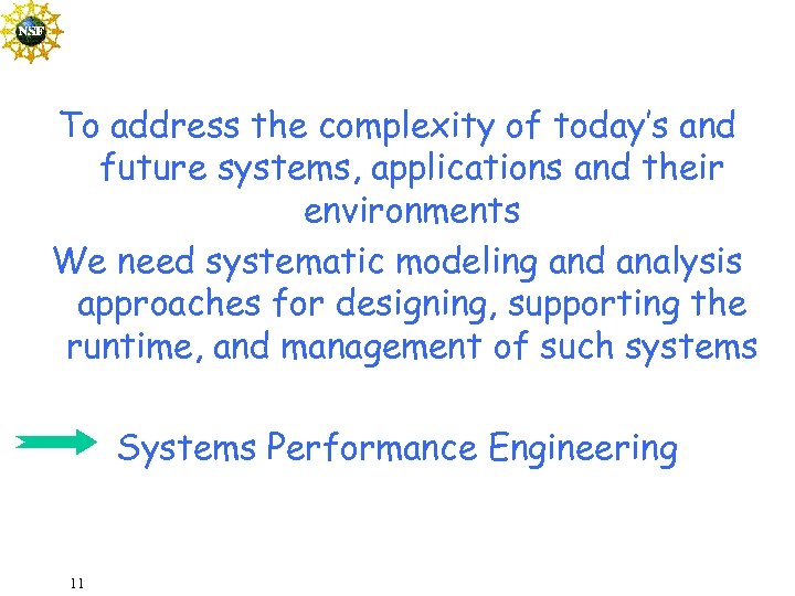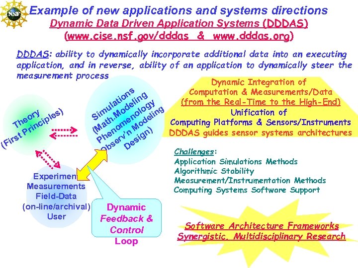 Example of new applications and systems directions Dynamic Data Driven Application Systems (DDDAS) (www. cise. nsf. gov/dddas & www. dddas. org) DDDAS: ability to dynamically incorporate additional data into an executing application, and in reverse, ability of an application to dynamically steer the measurement process ) y or iples e Th rinc P st r (Fi Experiment Measurements Field-Data (on-line/archival) User Dynamic Integration of s Computation & Measurements/Data on ling i (from the Real-Time to the High-End) lat de ogy g u Unification of im. Mo nol elin S th e Computing Platforms & Sensors/Instruments a om Mod M n n ) ( e DDDAS guides sensor systems architectures n h erv’ sig P s De b O Challenges: Application Simulations Methods Algorithmic Stability Measurement/Instrumentation Methods Computing Systems Software Support Dynamic Feedback & Control Loop Software Architecture Frameworks Synergistic, Multidisciplinary Research