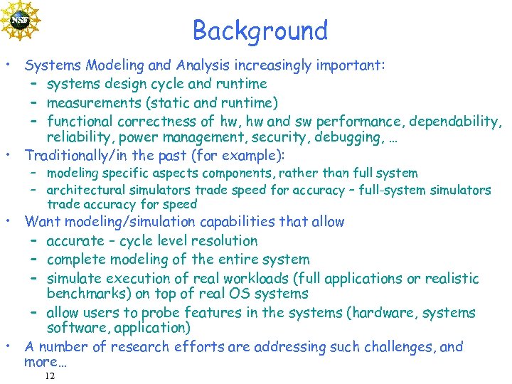 Background • Systems Modeling and Analysis increasingly important: – systems design cycle and runtime – measurements (static and runtime) – functional correctness of hw, hw and sw performance, dependability, reliability, power management, security, debugging, … • Traditionally/in the past (for example): – modeling specific aspects components, rather than full system – architectural simulators trade speed for accuracy – full-system simulators trade accuracy for speed • Want modeling/simulation capabilities that allow – accurate – cycle level resolution – complete modeling of the entire system – simulate execution of real workloads (full applications or realistic benchmarks) on top of real OS systems – allow users to probe features in the systems (hardware, systems software, application) • A number of research efforts are addressing such challenges, and more… 12