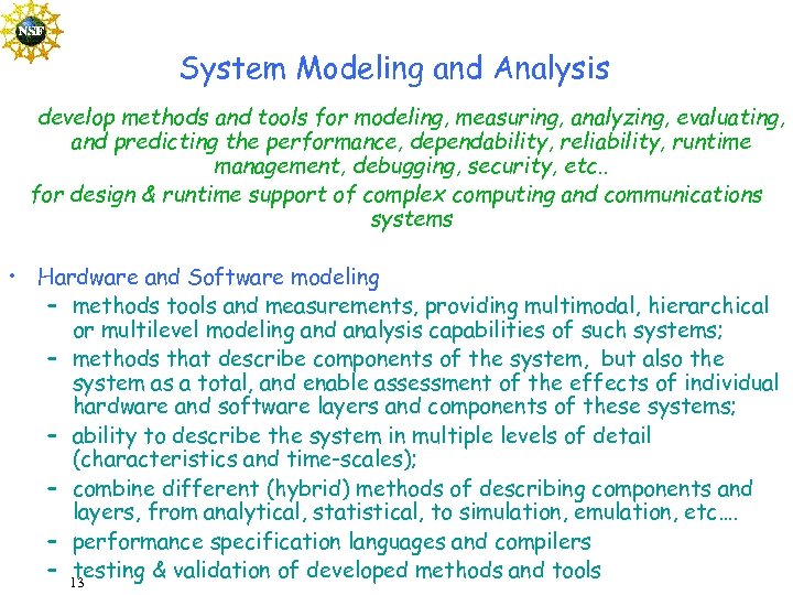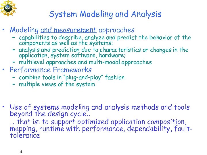 System Modeling and Analysis develop methods and tools for modeling, measuring, analyzing, evaluating, and predicting the performance, dependability, reliability, runtime management, debugging, security, etc. . for design & runtime support of complex computing and communications systems • Hardware and Software modeling – methods tools and measurements, providing multimodal, hierarchical or multilevel modeling and analysis capabilities of such systems; – methods that describe components of the system, but also the system as a total, and enable assessment of the effects of individual hardware and software layers and components of these systems; – ability to describe the system in multiple levels of detail (characteristics and time-scales); – combine different (hybrid) methods of describing components and layers, from analytical, statistical, to simulation, etc…. – performance specification languages and compilers – 13 testing & validation of developed methods and tools