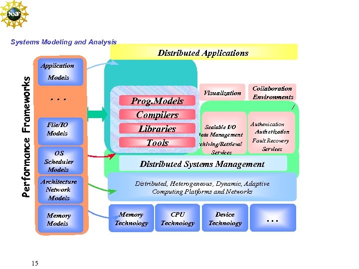 System Modeling and Analysis • Modeling and measurement approaches – capabilities to describe, analyze and predict the behavior of the components as well as the systems; – analysis and prediction due to characteristics or changes in the application, system software, hardware; – multilevel approaches and multi-modal approaches • Performance Frameworks – combine tools in “plug-and-play” fashion – multiple views of the system • Use of systems modeling and analysis methods and tools beyond the design cycle. . … that is: to support optimized application composition, mapping, runtime with performance, dependability, faulttolerance 14