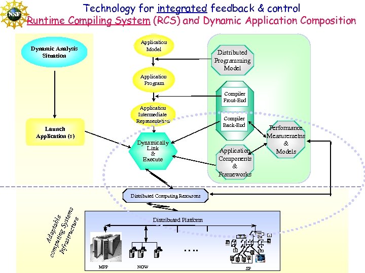 Technology for integrated feedback & control Runtime Compiling System (RCS) and Dynamic Application Composition Application Model Dynamic Analysis Situation Distributed Programming Model Application Program Compiler Front-End Application Intermediate Representation Compiler Back-End Launch Application (s) Dynamically Link & Execute Performance Measuremetns & Models Application Components & Frameworks com Adapt puti able Infr ng Sy astr s uctu tems re Distributed Computing Resources Distributed Platform tac-com alg accelerator …. MPP NOW fire cntl data base fire cntl SAR SP