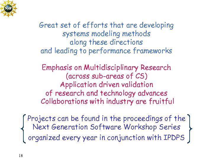 Great set of efforts that are developing systems modeling methods along these directions and leading to performance frameworks Emphasis on Multidisciplinary Research (across sub-areas of CS) Application driven validation of research and technology advances Collaborations with industry are fruitful Projects can be found in the proceedings of the Next Generation Software Workshop Series organized every year in conjunction with IPDPS 18