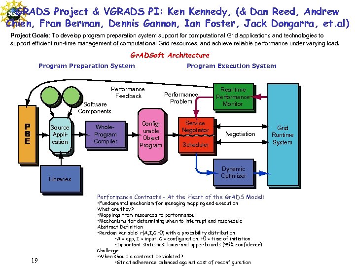 GRADS Project & VGRADS PI: Kennedy, (& Dan Reed, Andrew Chien, Fran Berman, Dennis Gannon, Ian Foster, Jack Dongarra, et. al) Project Goals: To develop program preparation system support for computational Grid applications and technologies to support efficient run-time management of computational Grid resources, and achieve reliable performance under varying load . Gr. ADSoft Architecture Program Preparation System Program Execution System Performance Feedback Software Components Source Application Libraries Whole. Program Compiler Configurable Object Program Performance Problem Service Negotiator Real-time Performance Monitor Negotiation Scheduler Dynamic Optimizer Performance Contracts - At the Heart of the Gr. ADS Model: 19 • Fundamental mechanism for managing mapping and execution What are they? • Mappings from resources to performance • Mechanisms for determining when to interrupt and reschedule Abstract Definition • Random Variable: r(A, I, C, t 0) with a probability distribution • A = app, I = input, C = configuration, t 0 = time of initiation • Important statistics: lower and upper bounds (95% confidence) Challenge • When should a contract be violated? • Strict adherence balanced against cost of reconfiguration Grid Runtime System